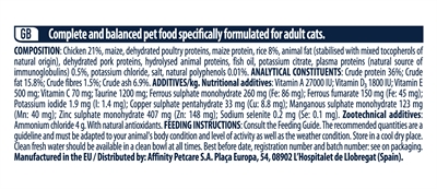 Composition : saumon (18%), protéines de maïs, riz (15%), protéines de saumon déshydratées, blé, graisse animale stabilisée avec un mélange de tocophérols d’origine naturelle, protéines de blé, maïs ;s, hydrolysat de protéines, pulpe de betterave, chlorure de potassium, protéines plasmatiques, source naturelle d’immunoglobulines (0,4%), inuline (0,4%), polyphénols naturels (0,01%)